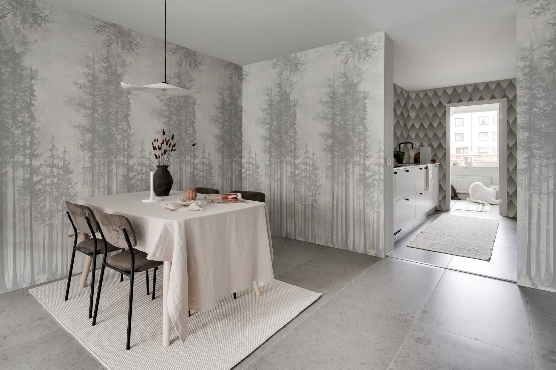 In the Morning, Pearl, es un patrón suave, casi místico, en agradables tonos de greige. El diseño representa un bosque de pinos pintado a mano con la luz del sol que se abre paso a través del dosel. Los motivos de la naturaleza a menudo tienen un efecto calmante. Los árboles se abren y se agrandan, dando una sensación de espacio y aire. Esta joya te proporcionará una merecida buena noche de sueño. Las pinceladas gruesas y las capas de pintura crean profundidad y un aspecto artístico. Daybreak es parte de la colección Imperfecciones que rinde homenaje a la belleza dentro de lo imperfecto, indómito y la historia detrás de lo desgastado y roto. La colección tiene influencias de la naturaleza, el estilo Japandi y Asia. Muestra una impresionante artesanía experimental y creatividad que es posible gracias a las modernas técnicas de impresión digital.